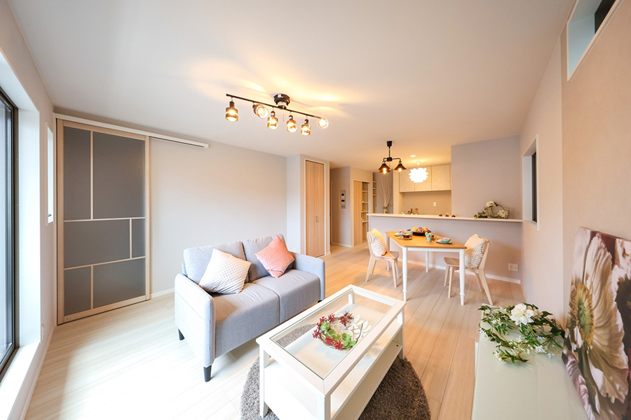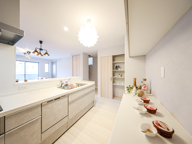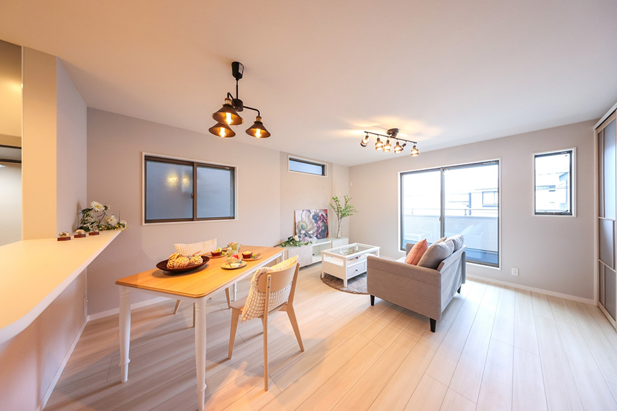包容力のある空間を演出するLIXIL ラシッサD キナリモダンを採用。人気のニュアンスカラーと優しい木目が魅力です♪雨の日にも便利なビルトインガレージは荷物の積み降ろしや日常の作業を快適に。直線上に配置し全体が見渡せるLDK は開放感たっぷりですよ。
