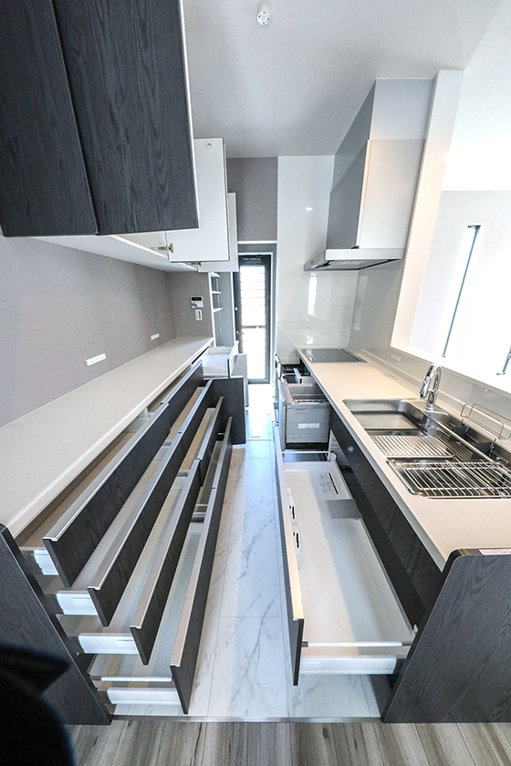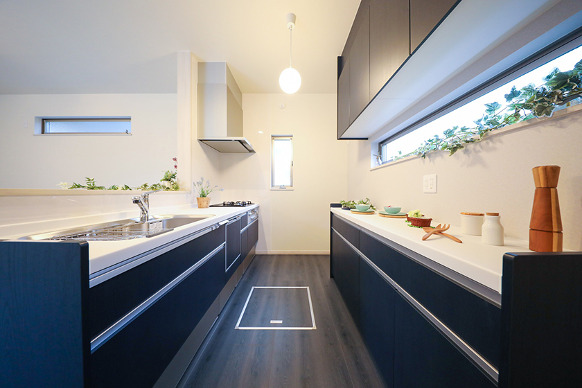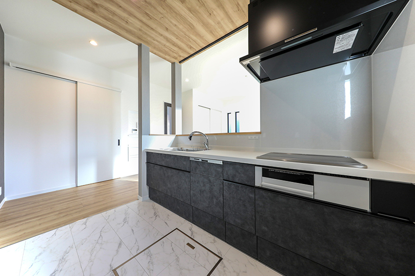 リビングダイニングが見渡せられるオープンなキッチン。お料理しながら子供の様子を見守ったり、家族との会話を楽しんだり。独りの時はテレビを見ながら楽しく台所仕事。