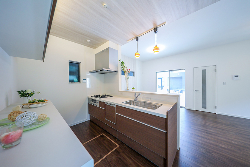 リビングダイニングが見渡せられるオープンなキッチン。お料理しながら子供の様子を見守ったり、家族との会話を楽しんだり。独りの時はテレビを見ながら楽しく台所仕事。